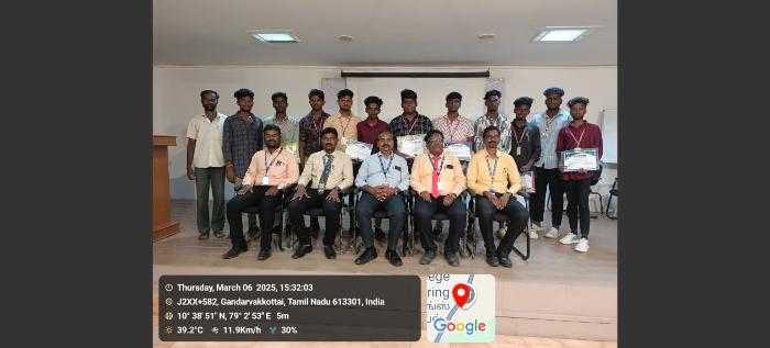 | R. Tamil Elakkiya, K. Pavithra, S. Vinitha, R. Apurva, D. Anusuya, K. Kowsalya, V. Vijay, S. Vasanth, V. Vinoth, R. Sarathkumar, B. Vidhyasagar, G. Saravanan, G. Sathyaraj, D. Parameshwaran, R. Vigneshkumar, M. Ragupathi, P. Nirmal Geeds, S. Ravikumar, M. Vignesh | Regional Level Technical Seminar on Post Tensioning Slabs in Buildings & Empowerment of Electrical Engineering for Civil Engineers | Civil Engineers and Architects Association, Thanjavur | 02.02.2019 |