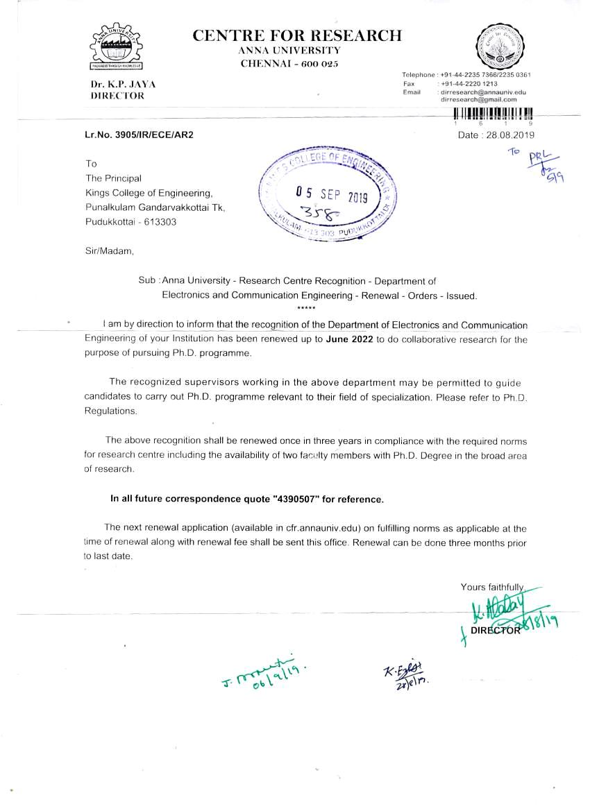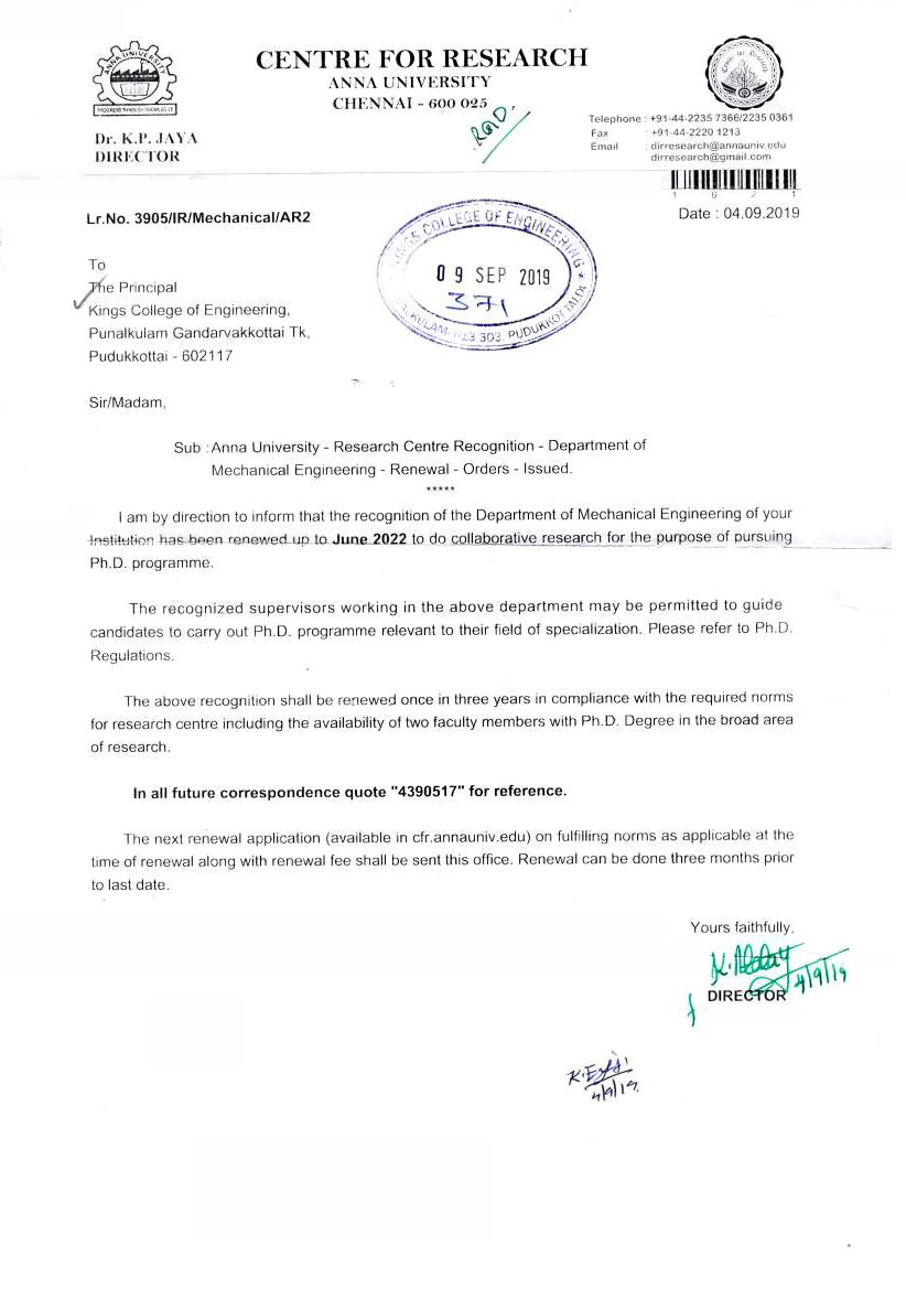 The Department of Electronics & Communication, Mechanical Engineering and Electrical & Electronics Engineering are recognized as research centers for collaborative research by Anna University, Chennai.
